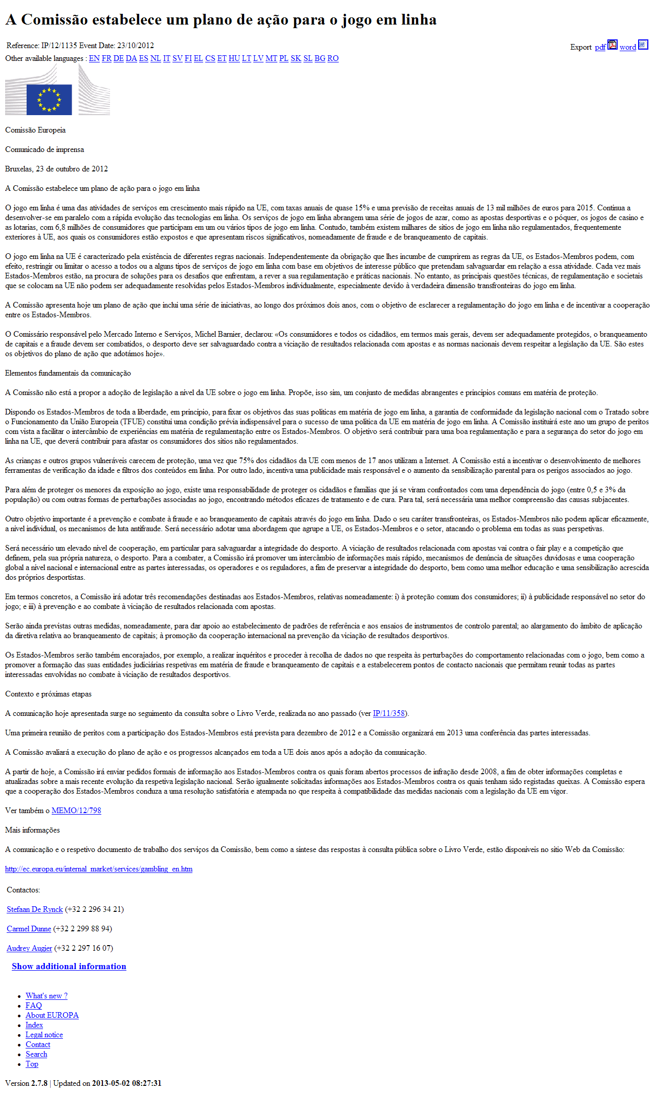 A comunicação e o respetivo documento de trabalho dos serviços da Comissão, bem como a síntese das respostas à consulta pública sobre o Livro Verde, estão disponíveis no sítio Web da Comissão: http://ec.europa.eu/internal_market/services/gambling_en.htm