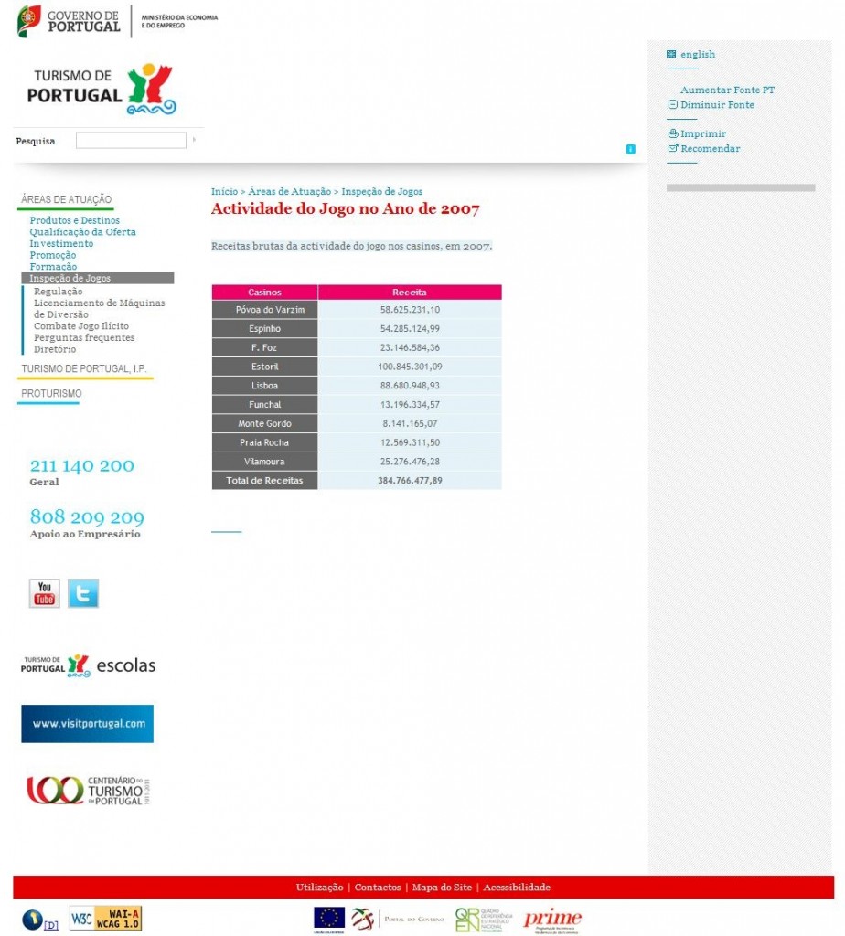 Receitas brutas da actividade de jogo nos casinos, em 2007.