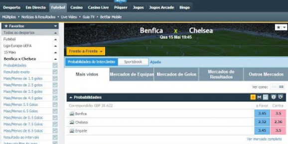 A foto deste post retirada do site da Betfair, em www.betfair.com permite verificar o número de mercados existentes para o jogo da final da Liga Europa entre o Benfica e o Chelsea. Como se pode constatar no lado esquerdo da foto a variedade de mercados é tal, que metade deles não é possível visualizar.